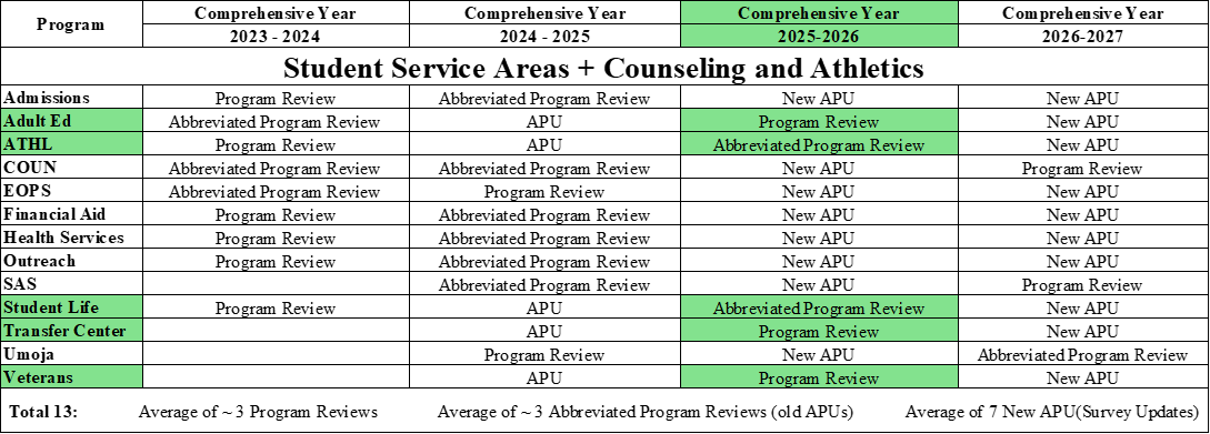 All Program highlighted in Green will be conducting either a Program Review or Abbreviated Program Review this coming academic year for 2025-2026.